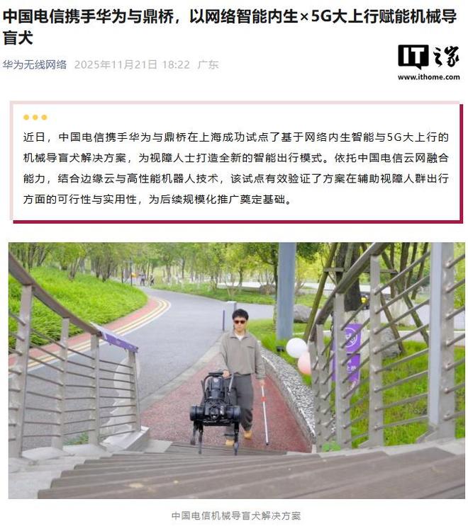 IT之家11月22日报道 据“华为无线网络”公众号消息,中国电信、华为、鼎桥近期在上海成功试点基于网络内生智能和5G上行的机械导盲犬解决方案,为视障人士打造全新出行模式。从官方介绍就在国内实现了,依托电信的云网融合能力,结合云端边缘和高性能机器人技术,此次试点有效证明了该方案在帮助残疾人出行方面的可行性和实用性,为后续的大推广奠定了基础。据统计,全球中度以上视力障碍人群多达3.38亿人,而服务导游数量不足1.9万人,远远不能满足实际需求。传统导盲犬不仅需要数年时间训练,而且花费数千美元s。供需严重失衡,限制了视障人士的出行自由和社会融入。在此次试点中,中国电信利用自主研发的网络智能内生技术和云网络编排技术,实现5G接入网统一调度和边缘算力。采用鼎桥智能四足机器人,搭载激光雷达、高清摄像头、RTK等高精度传感器作为终端设备,中国电信与华为合作开发的5G大上行网络,实现随时随地20Mbps的上行速率,保证大规模实时数据传输和计算测试的高效分流。在此基础上,该方案通过终端网络的协同架构,将部分计算任务卸载到云端,显着减轻了终端的计算负担,有利于延长机械导轨的电池寿命狗,为未来嵌入式智能终端的大规模部署提供了可能。在上海开放道路、公园、社区等多个场景的测试中,机械导盲犬能够准确识别行人、楼梯、坡道、快速行驶的自行车等障碍物,依靠边缘计算能力实时规划路径,并通过语音交互全程引导用户。参与测试的视力障碍人士表示,该设备显着扩大了他们的活动范围。