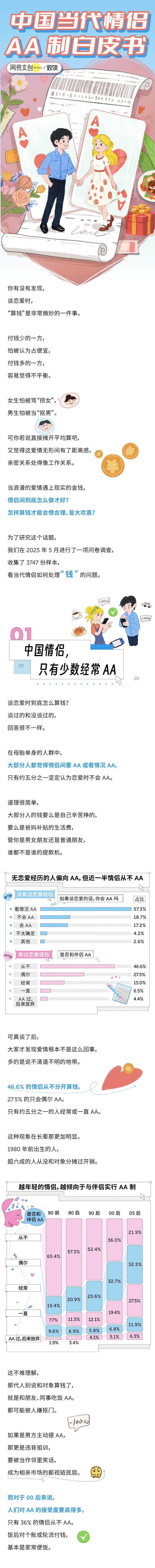 当社会观念发生变化,人们越来越强调亲密关系中的男女平等和经济独立时,AA制被公开,并被许多夫妇认为是最好的解决方案。