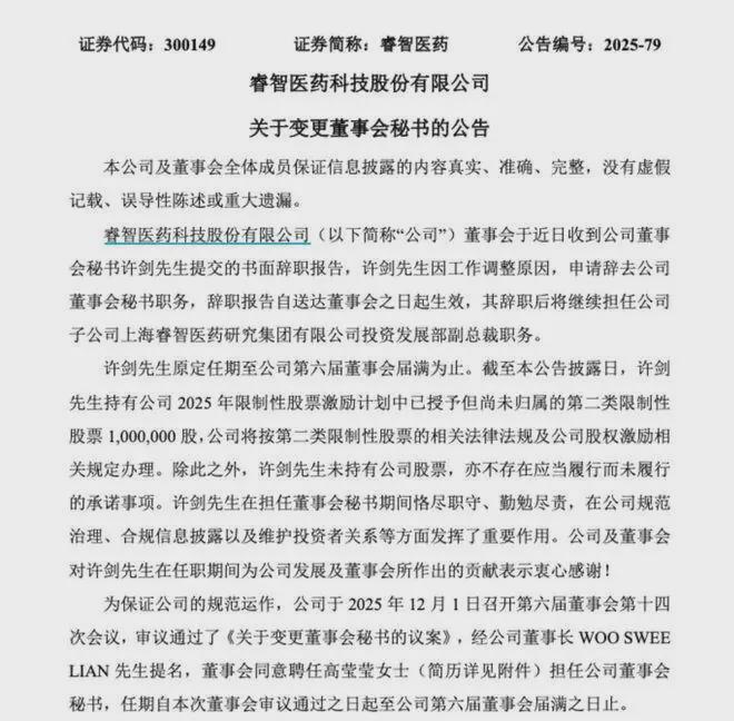 智慧医疗(300149)聘请了90后“跨界”女董事会秘书高莹莹,她曾担任电台主持人多年。一位1994年出生的美女主持人被聘为董事会秘书。 12月1日,锐志药业公告称,公司董事会于近日收到董事会秘书徐健的书面辞职报告。徐健因工作安排原因申请辞职。其原任期至公司第六届董事会任期届满为止。同日,公司审议通过了《关于更换董事会秘书的议案》。经公司董事长Woo Sweelian任命,董事会同意任命高莹莹为公司董事会秘书。任期自董事会审议通过之日起至公司第六届董事会任期届满之日止。公开信息显示,高银庆英出生于1994年,具有中国国籍,无境外永久居留权。他拥有学士学位,正在上海师范大学攻读MBA。 2016年7月至2020年3月,在阳江广播电视台担任策划、主持人、导演、编辑; 2020年3月至2022年9月,在中山广播电视台担任主持人、栏目策划、编辑。在此期间,高莹莹与双胞胎妹妹高晶晶共同主持了《晶莹看透》、《晶莹宝贝》、《文学聆听》、《水过》等台柱。此外,他还于2018年至2020年连续三年登上黑龙江省伊春市2019年春晚舞台、广东省阳江市春晚舞台。2022年11月,高莹莹加入中山安信新零售有限公司担任推广总监。 2025年12月再次穿越,被聘为董事会秘书y 智能制药公司。对照锐志药业董事会秘书履历信息,徐健,1984年出生,2010年7月获得中山大学法学硕士学位。2010年8月至2016年1月,担任古海证券股份有限公司投资银行部高级经理; 2016年至2021年11月,担任平安证券股份有限公司投资银行部高级产品经理,负责或参与多家公司股票首次公开发行、上市公司重组及重大重组项目。 2021年11月起担任锐志药业董事会秘书。锐志药业在公告中强调,高莹莹具备担任董事会秘书所需的工作经验和知识。获得《上市公司董事会秘书培训证书》深圳证券交易所使用。其任职资格符合相关规定,不存在不存在禁止担任公司高级管理人员的情形。董事会秘书近三年平均年薪约为150万元。锐志药业对董事会秘书一职的重视,从薪酬待遇就可以看出。数据显示,公司近三年(2022年~2024年)支付给董事会秘书的年薪分别为167万元、144.43万元、150.8万元。与广东省申万生物医药行业54家A股公司净利润相比,锐志药业净利润排名第21位、第53位、第44位,而同期董事会秘书薪酬水平排名第12位、第12位、第8位。我们从马克的角度来看一下智慧医疗董事会的薪资水平等值。分别以2022年、2023年、2024年12月31日为统计市值水平,对应的智慧医疗市值分别约为52.03亿元、38.23亿元、32亿元。根据同期广东省市值30亿元至60亿元的上市公司统计,锐志药业董事会秘书的薪酬排名分别为9位、17位、12位,均处于较高位次。在近年来业绩大幅波动的背景下,斯玛特药业常年高薪聘请董事会秘书。近年来情况如何?资料显示,智慧医疗的主要业务包括化学业务板块、药效及药效业务板块、高分子业务板块。近年来,智慧医疗的表现犹如“过山车”,呈现出显着的波动。 2020年至2024年,公司净利润分别为1.55亿元、-4.02亿元、3.63亿元、-9.17亿元、-2.26亿元。总体来看,公司去年的亏损尚未弥补,近五年净利润亏损合计已超过10亿元。公司近日发布的2025年三季报显示,公司前三季度实现营业收入8.17亿元,同比增长13.7%;归属于母公司净利润成功扭转去年同期6167万元的亏损,实现归属于母公司净利润709万元;扣除母公司未调整盈利后净利润由去年同期亏损6904万元变为亏损1435万元,亏损有所减少;经营现金流净额1.2亿元,同比增加f 6.8%。其中,第三季度,公司营业收入2.83亿元,同比增长11.7%;归属于母公司净利润亏损1829万元,同比下降1575.7%;扣除母公司非必需收入后的净利润由去年同期的亏损500万元增至亏损2114万元,亏损进一步扩大。据每日经济新闻采访,北京大学汇丰商学院常任副教授、汇丰金融研究院副院长李迪表示,从学术研究的角度来看,一方面,女性董事会秘书往往表现出更加谨慎的决策风格,企业政府的风险规避意识更强;一方面,高莹莹具有女性相同的身份和主持人的先知民族性质,这使得更容易建立连贯性。用于对外沟通、投资者关系维护等场景。他之前的工作经历所积累的人际关系和社会资源网络也有望为外部企业关系乃至投融资工作提供帮助。