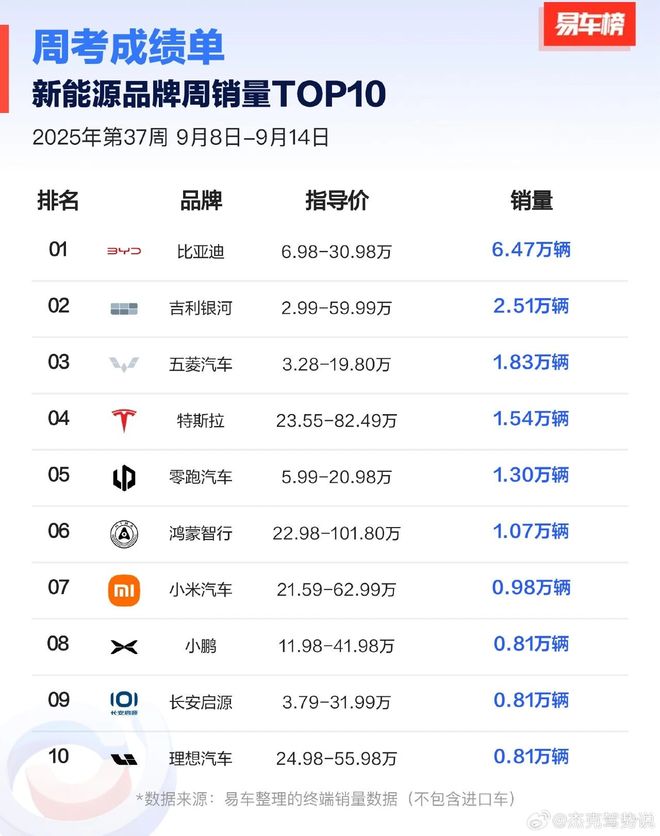 2025年第37周的销量发布。在9月第二周的销售清单中,两个配方豹和莱多的子部分表现良好,他们只能进入新部队的十大名单。同时,零游戏销售额已建立了10,000多元人民币,而小米汽车接近每周出售10,000元人民币。另一个变化是在Lantu推出新车之后,每周的销售接近Zekr,这是它已经出现了很多年了。评论:9月8日至9月14日的销售量:BYD品牌:64,700方程豹4,210,一个品牌进入了前十名新部队。浏览量:140 Tengshi(参数|图片)2,180辆汽车,D9卷销售1,710辆和N9 240辆车。 2。Tesla有15350 Sasakyan:Y型9460辆车; YL 1030型车辆,型号3 4860车辆。 3。吉利拥有14,900辆汽车,银河系有10,300辆汽车,覆盖25,200辆汽车。 4。4。18,400沃林车辆。 5。ZERO-Play具有13,010个单位,C10的销量为3,220台,C11销量为2,490台,B01销量为2,870辆,而B10销量为1,810个单位。令人惊讶的是,B01的销量比B10更好。 6。盛大的Zhixing有10,700辆汽车,Wenjie中有8,580辆汽车:M8销量为4,770辆,M9销量为2,510辆汽车; Xiangjie S9 500车; Zhijie 980辆和R7销量为640辆汽车; Zunjie S800的销量在一个星期内为360辆汽车,比Zhijie S7还要多。 7。小米汽车的销量为9790:YU7销量为4,620,SU7销量为5,170,估计下周将超过10,000。 8。小电动机有8140个单位:M03销量为3170个单位,P7的销量为1760台,P7+的销量为1140,而新的G7销量为710个单位,不及900个Xiaopeng G6。 9。理想的8060车辆,L6 3050车辆,L9 1030车辆,理想的i8 1260辆,理想的巨型830辆车。理想的i8卖出的不仅仅是模型YL,而且转弯。 10。Nio有6180辆汽车:Nio在整个系列中都有2430辆汽车; Ledao拥有2620辆汽车,L90拥有2050辆汽车,而Ledao Single品牌进入了前十名。萤火虫有1130辆汽车。 11。4,500深蓝色汽车。 12. Zekrch 3250车辆:7倍销售量为1,140辆,007销售量为790辆,我们知道007GT是否是WA Waveloy;销量为860辆,009的销量为310辆。 13. Lantu Automobile拥有3,230辆汽车,Dreamer销量为1,190辆,Lantu Free+销量为810辆汽车,每月每月拒绝25%,Lantu Zhiyin具有950辆汽车。值得一提的是,魏帕高山(Weipai Gaoshan)销售1,900辆汽车,超过了梦dream以求的人。 14. Avita出售了1,400辆汽车,主要部队为770 Avita 06车辆,Avita 07售出340辆汽车,而Avita 12出售240辆汽车。 15。圣战汽车2060。16。Zhiji汽车1,260辆汽车。