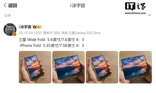 IT之家12月25日报道 数码博主@ibingunishu昨天(12月24日)在微博发布了一组效果图,对比了三星Wide Fold和苹果iPhone Fold这两款“宽折叠”手机,展示了两大科技巨头在折叠屏领域的最新博弈。消息人士展示的两款可折叠手机渲染图的内部屏幕均采用4:3的比例。三星Wide Fold的外屏为5.4英寸,内屏为7.6英寸,而iPhone Fold的外屏为5.35英寸,内屏为7.58英寸。虽然整体框架基本相同,但两者设计语言的差异主要体现在边角处理上。三星延续了硬朗的商务风格,在右翼附近采用了锋利的边缘设计,让设备在折叠状态下更加方正统一。相比之下,苹果倾向于使用R的更柔软的圆角,预计会适合手掌握持时更紧密,避免直角带来的“割手感”。除了尺寸和形状之外,有关 iPhone Fold 的其他细节仍然存在相互矛盾的报道。 IT之家此前报道称,另一位爆料者 FrontPageTech 指出,iPhone Fold 将只有黑白两种颜色,并且屏幕的内折将“完全隐形”。不过,消息人士马克斯·詹博尔对此持保留态度。他认为物理折痕仍将存在,但与现有产品相比将“不太明显”。